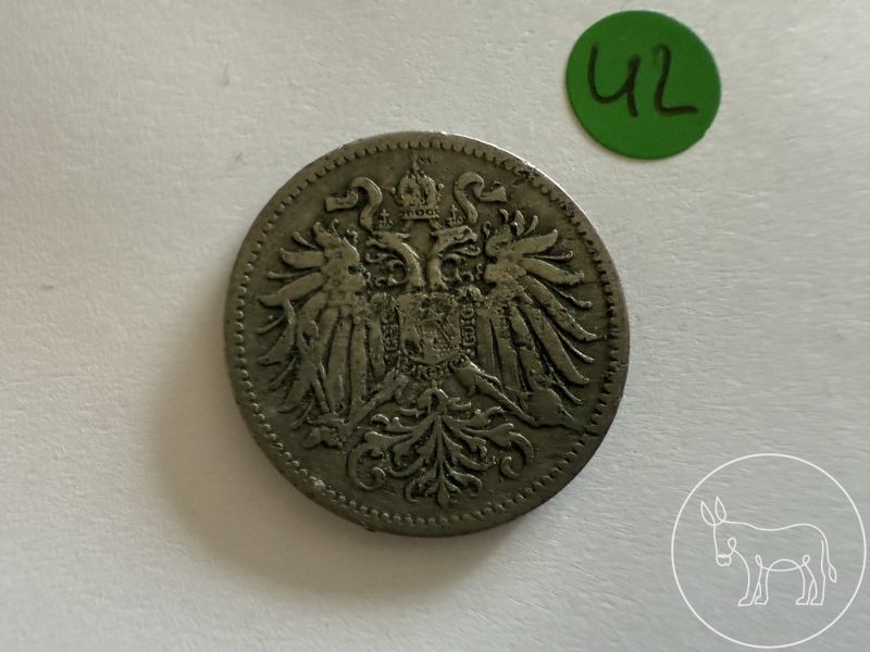 Österreichische 10 Heller Münze, Prägungsjahr 1893, geprägt unter Kaiser Franz Josef I. Die Münzen bestehen aus Nickel und zeigen an der Vorderseite die Wertzahl "10" innerhalb eines Eichenkranzes, darunter das Prägungsjahr. Auf der Rückseite befindet sich der gekrönte, doppelköpfige Wappenadler Österreichs mit Schwert und Reichsapfel und auf seiner Brust das Wappenschild des Hauses Habsburg-Lothringen. Die Münzen wurden während der Regierungszeit von Kaiser Franz Joseph I geprägt.
