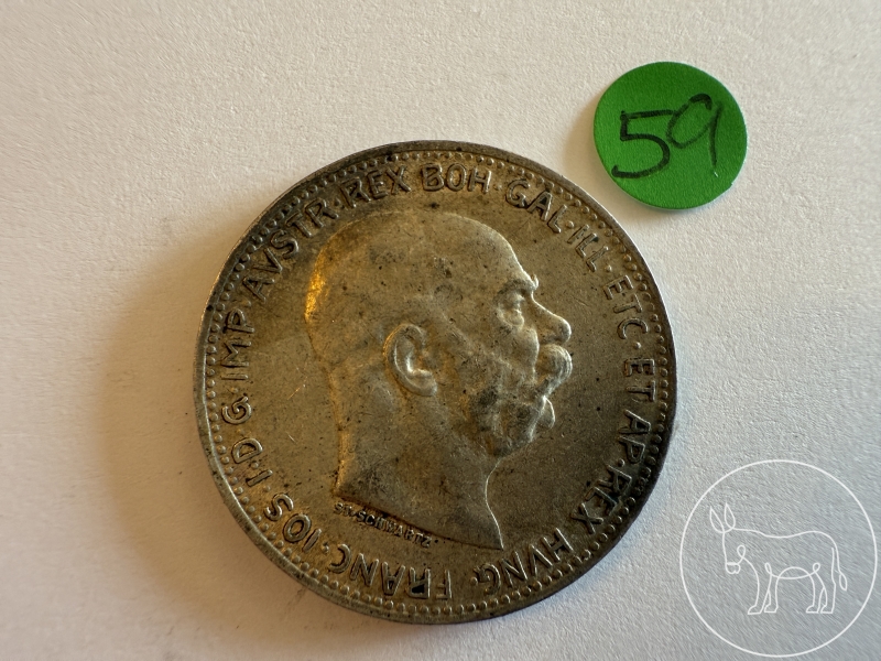 Sie gehört zur Österreichisch-ungarischen Krone (von 1892-1918 die Geldwährung in Österreich-Ungarn - in Ungarn Korona genannt). Vorderseite: Stephanskrone, Rückseite Portrait von Kaiser Franz Joseph I. FRANC.IOS.I.D.G.IMP.AVSTR.REX BOH.GAL.ILL.ETC.ET AP.REX.HVNG. Prägungsjahr 1915. St. Schwartz