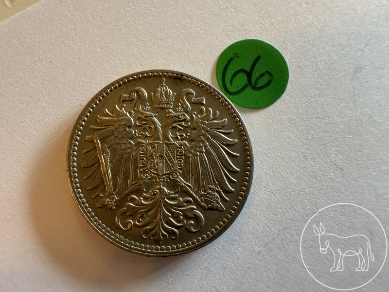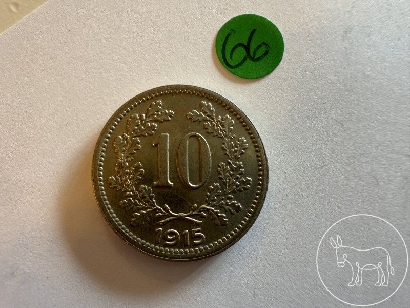 Österreichische 10 Heller Münze, Prägungsjahr 1915, geprägt unter Kaiser Franz Josef I. Die Münzen bestehen aus Nickel und zeigen an der Vorderseite die Wertzahl "10" innerhalb eines Eichenkranzes, darunter das Prägungsjahr. Auf der Rückseite befindet sich der gekrönte, doppelköpfige Wappenadler Österreichs mit Schwert und Reichsapfel und auf seiner Brust das Wappenschild des Hauses Habsburg-Lothringen. Die Münzen wurden während der Regierungszeit von Kaiser Franz Joseph I geprägt.