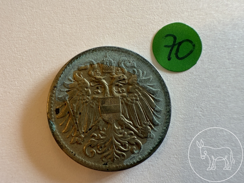 Österreichische 10 Heller Münze, Prägungsjahr 1915, geprägt unter Kaiser Franz Josef I. Die Münzen bestehen aus Nickel und zeigen an der Vorderseite die Wertzahl "10" innerhalb eines Eichenkranzes, darunter das Prägungsjahr. Auf der Rückseite befindet sich der gekrönte, doppelköpfige Wappenadler Österreichs mit Schwert und Reichsapfel und auf seiner Brust das Wappenschild des Hauses Habsburg-Lothringen. Die Münzen wurden während der Regierungszeit von Kaiser Franz Joseph I geprägt.