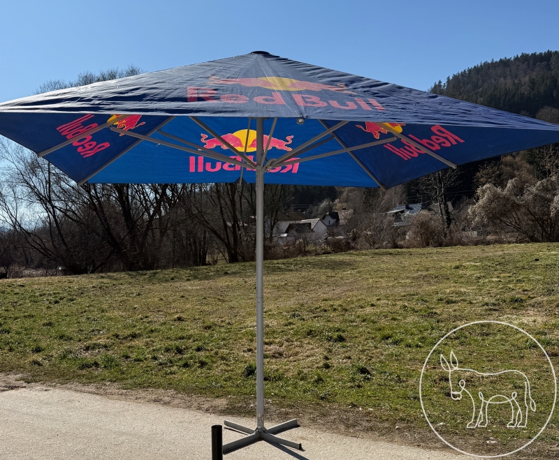 Red Bull Schirm mit Gebrauchsspuren (ein Loch), ohne Hülle, 3,5x3x5cm, Höhe, inkl. Ständer