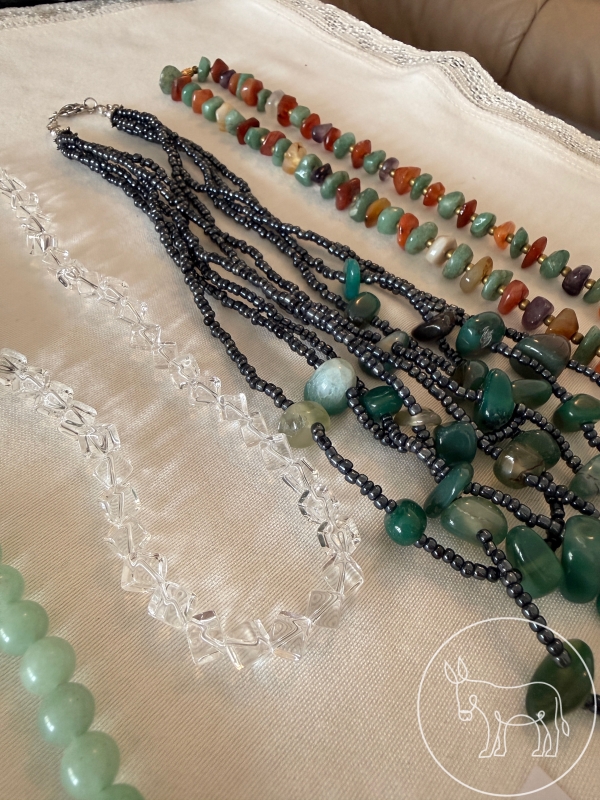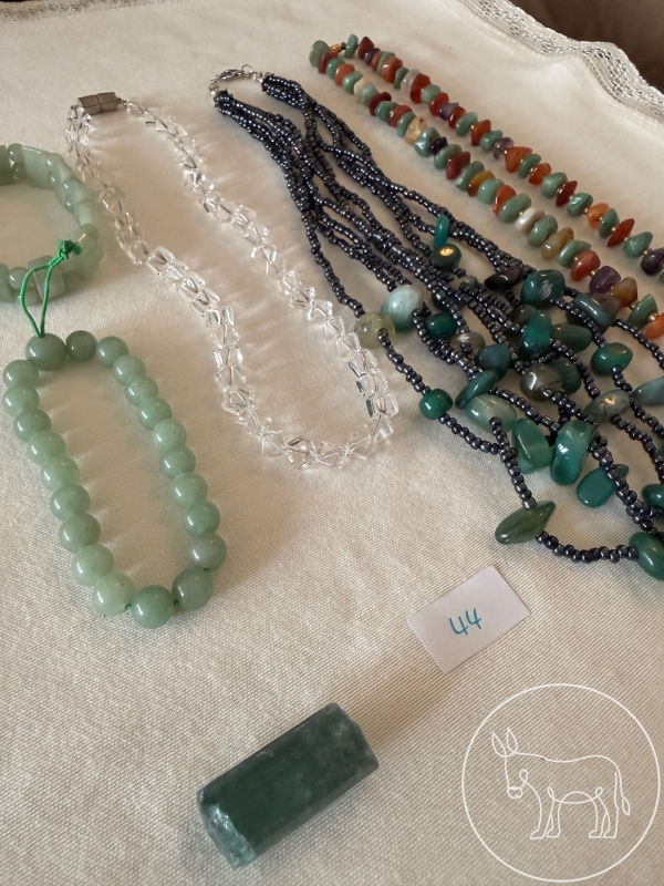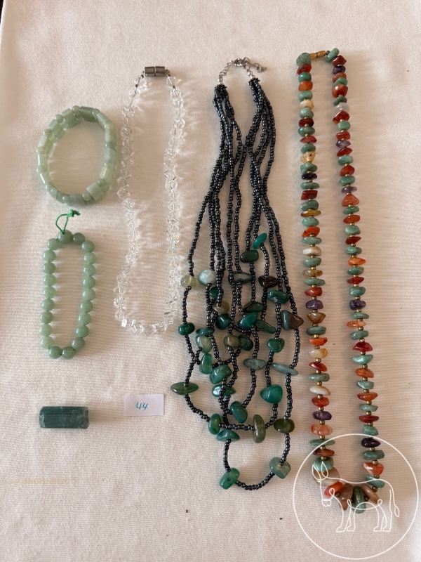 Set aus 3 Ketten, 2 Armbändern und Kristall. Serpentin, Bergkristall, Karneol und wenig Amethyst.
