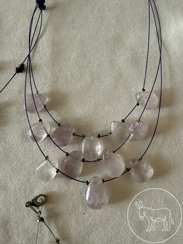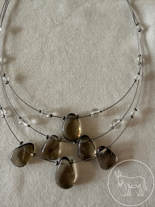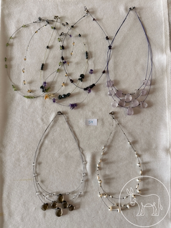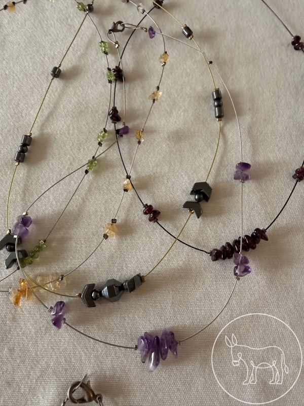 8 Ketten (ein- und mehrreihig) aus Edelstahldrähten mit Schmucksteinen und Süßwasserperlen. Rauchquarz, Amethyst, Granat, Hämatit, Citrin, Peridot...