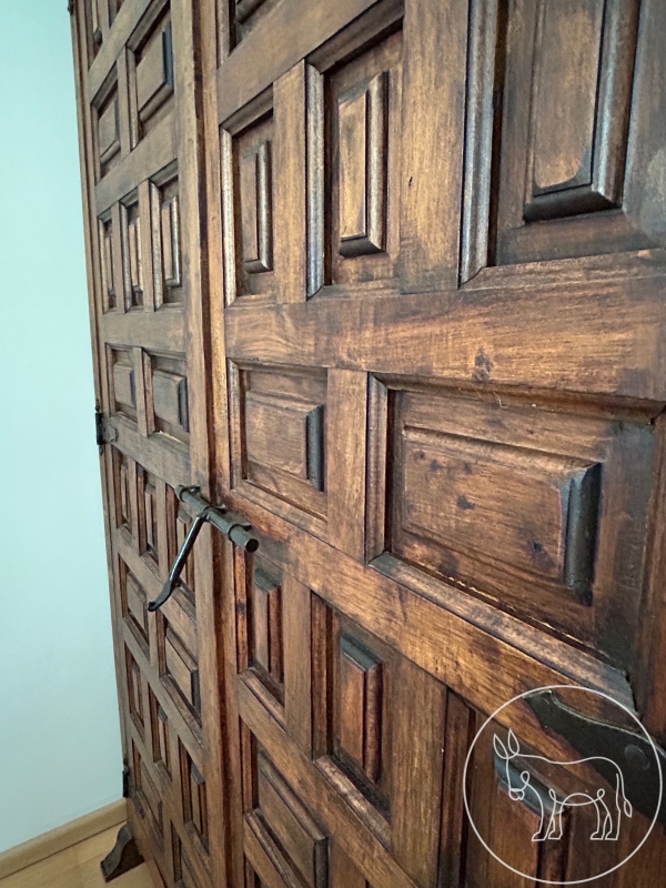 Schmaler Schrank mit Holzeinlegeböden. Maß: 108x34x65cm. Massiv. Kasettenförmige Fronten, Spanischer Kolonialstil oder rustikaler Landhausstil
