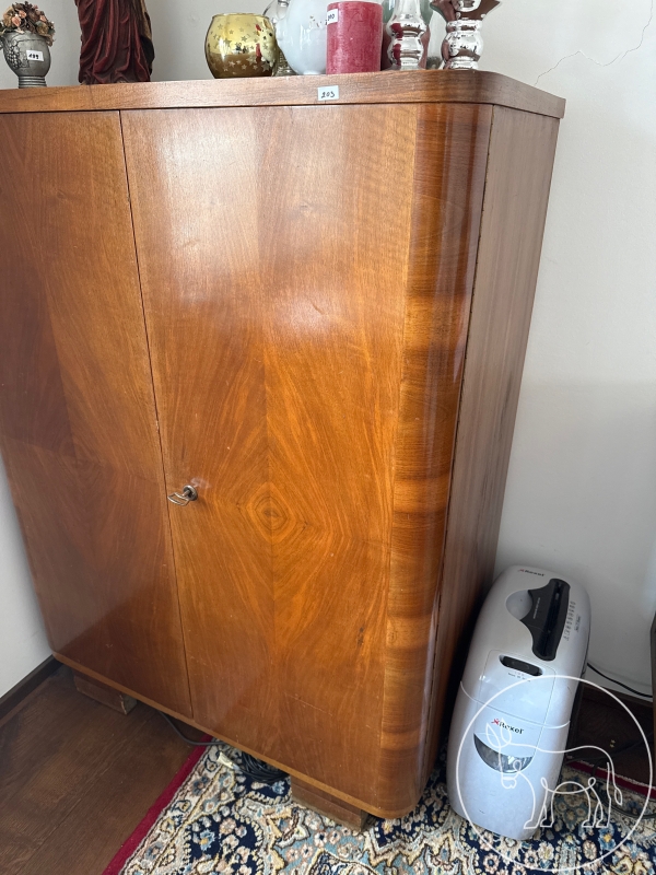 massiver Schrank, Mid-Century-Stil aus den 1940er Jahren, edles Echtholzfurnier auf klobigen kurzen Beinen, mit Fächern. Maß 98x53x131cm. (ohne Inhalt)