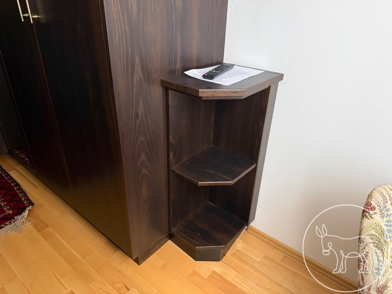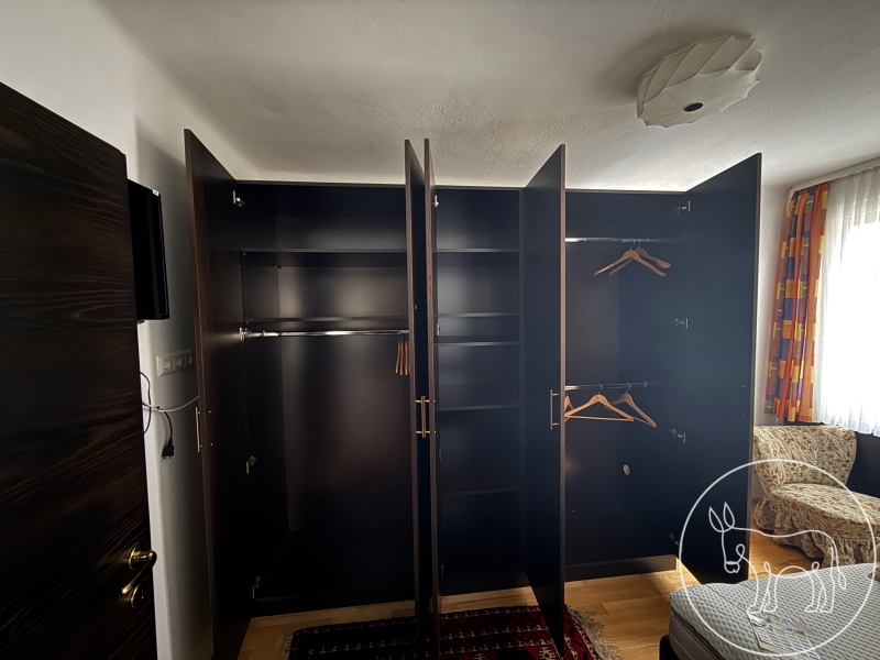 Holzschrank mit 5 Türen und einem Spiegel. Fächer zum Legen und zum Hängen, mit seitlichem Anbau-Regal. Schrank 258x63x228cm (inkl seitlicher Blende). Anbauregal: 31x42x93cm mit abgeschrägter Ecke. Dunkelbraun mit goldenen Beschägen, neuwertig.