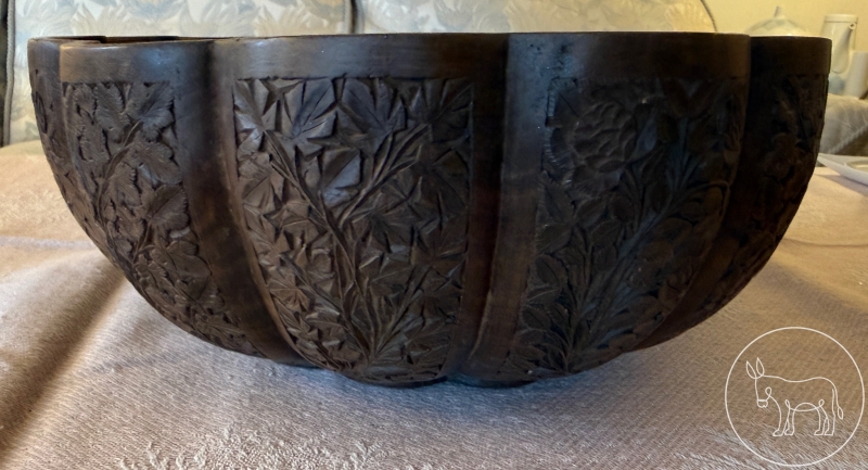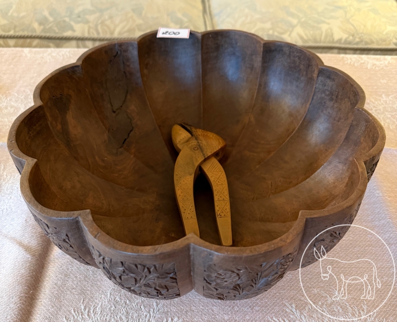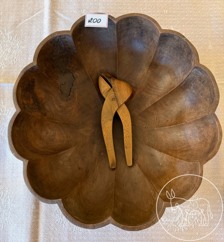 wunderschön geschnitzte Nußholzschale (aus einem Stück geschnitzt) mit gewelltem Rand und Schnitzerei an der Außenwend kombiniert mit einem Nußknacker aus Holz. Durchmesser der Schale: ca. 34,5cm, Höhe ca. 13,5cm.