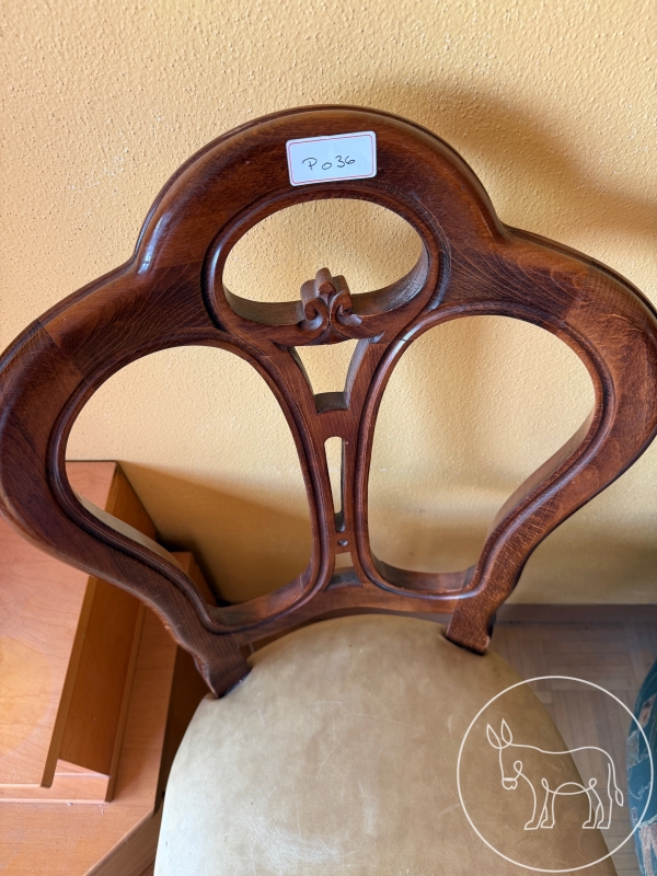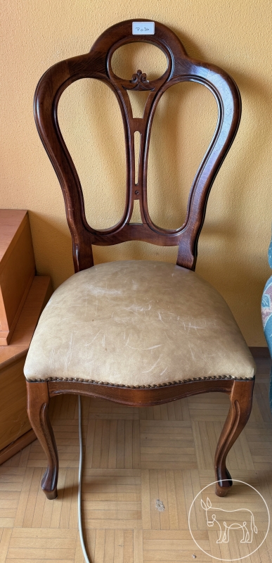 brauner geschwungner Holzsessel, Lederbezogen, 47x44cm, Sitzhöhe 50cm, Gesamthöhe 105cm