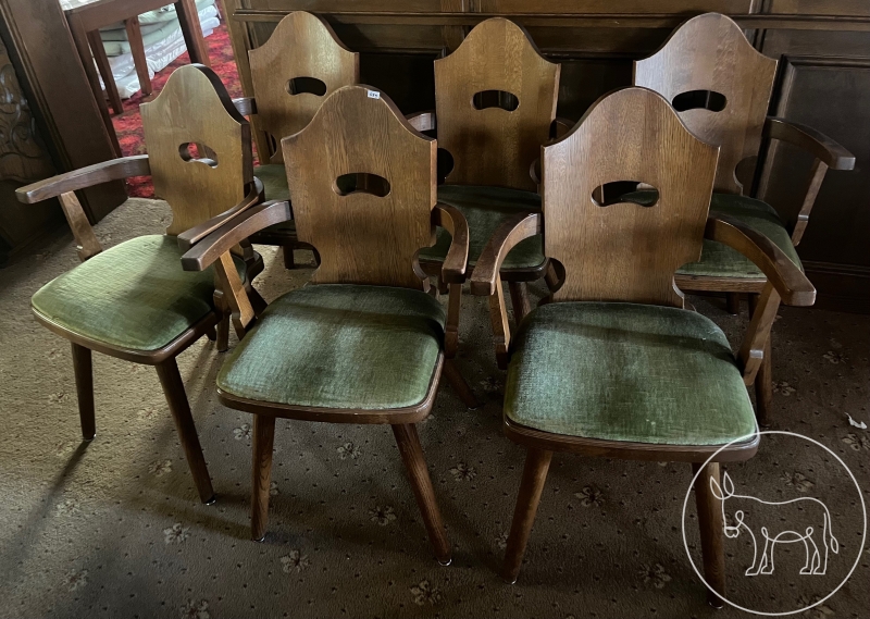 5 Stück, aus Holz mit grünem Stoffüberzug auf der Sitzfläche, 45x40x47cm, Gesamthöhe: 90cm