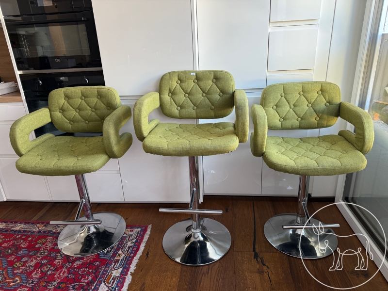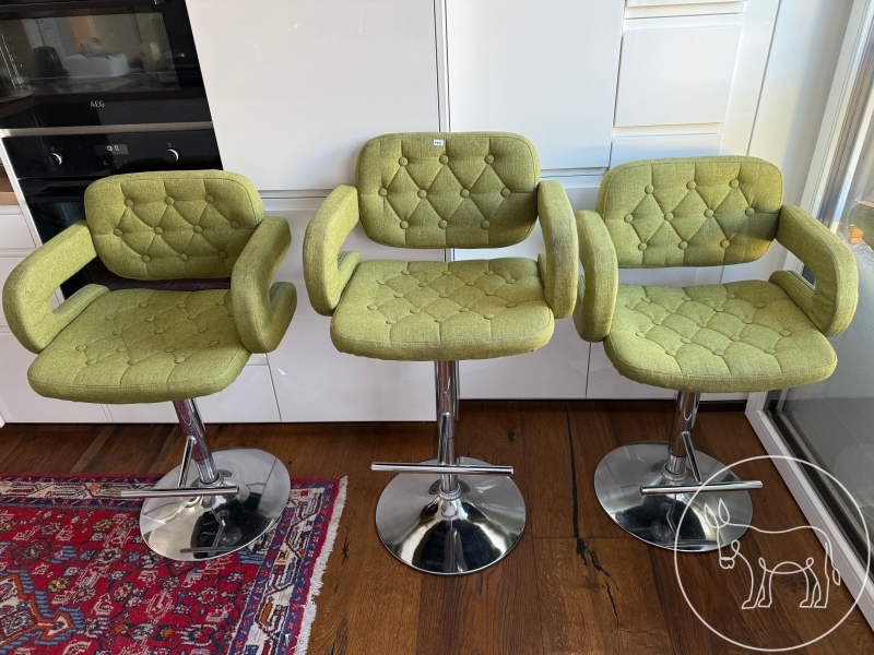 grün bezogen mit Chesterfield Steppung und geschwungenen Armlehnen, stufenlos höhenverstellbar mit Chrom-Fuß und Fußablage. 61x50cm.