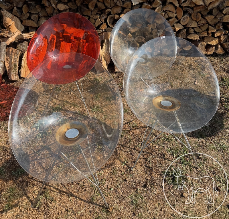 62x70x82cm. Kunststoffschale auf Metallfuß, 3x transparent, 1x orange.
