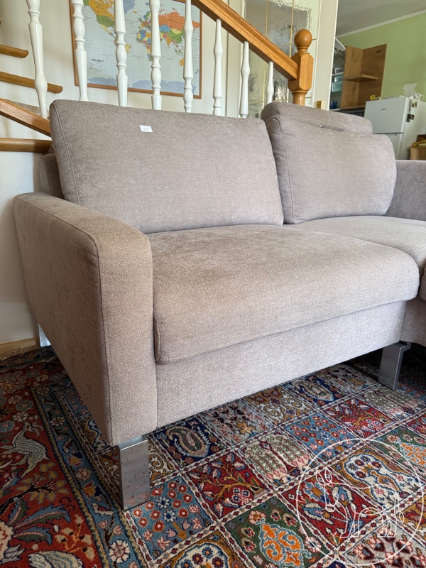 Stoffbezogene Couch in L-Form, 1 Kissen fehlt. Maß: 225x185cm. Sitztiefe ca. 90cm. Sitzhöhe ca. 50cm, Gesamthöhe ca. 80cm.