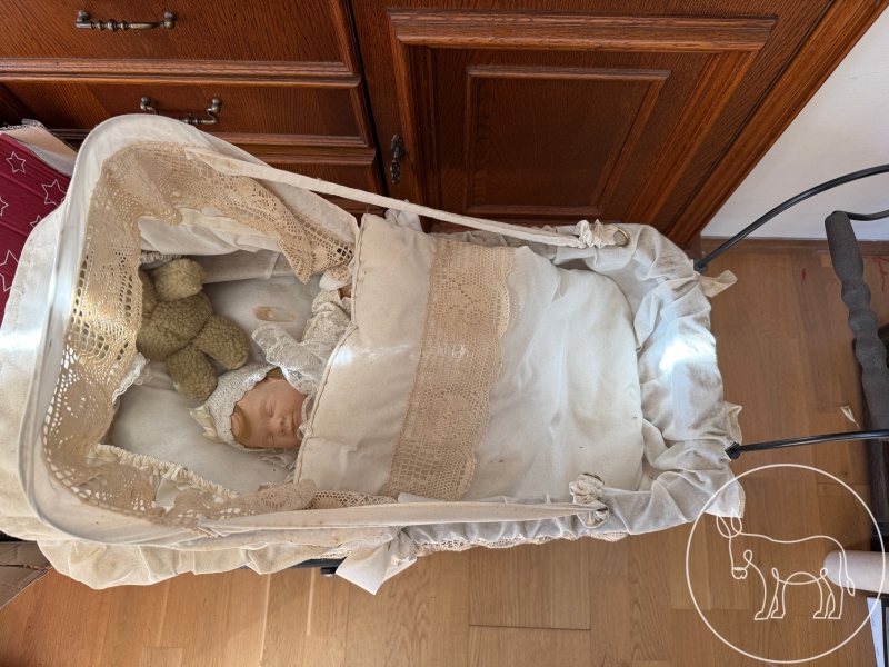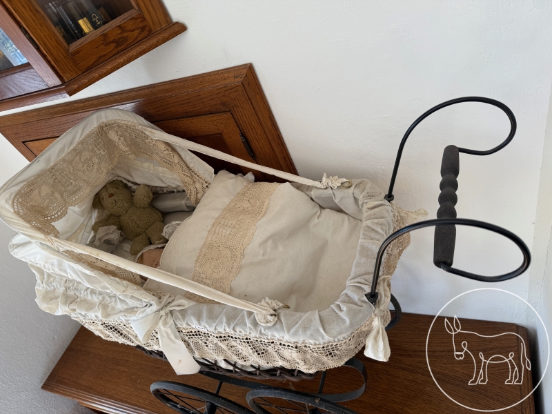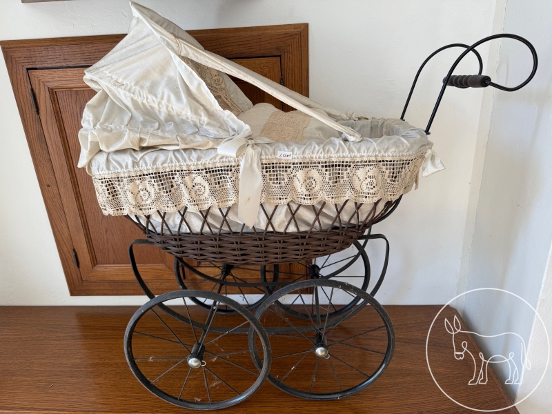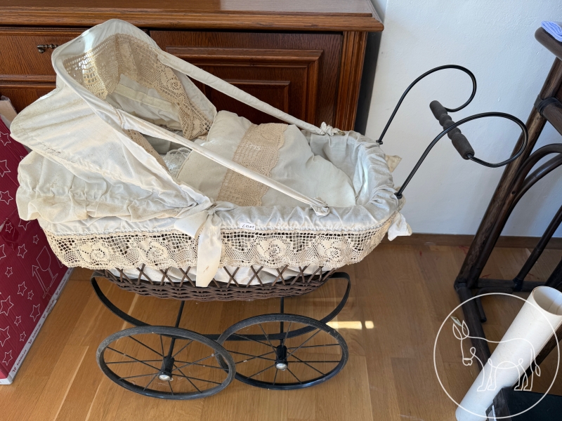 Metallpuppenwagen mit Korbgeflecht und Puppe
