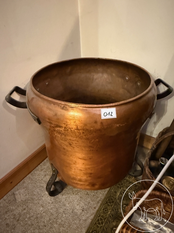 Antiker, handgefertigter Kupferkessel mit Nieten und Eisenhenkeln - wurde ursprünglich für Holz benutzt. D 42cm, H48cm.