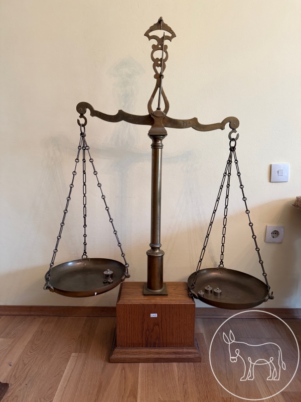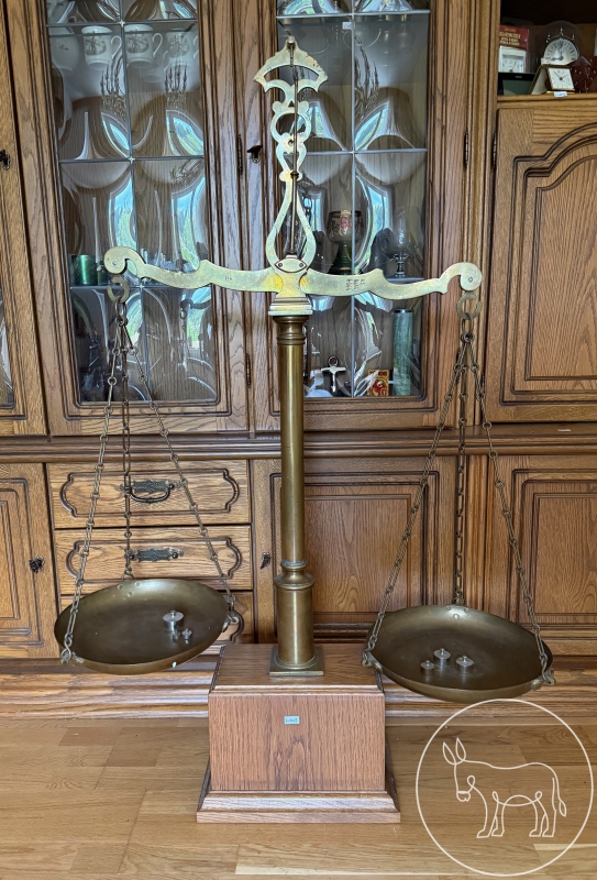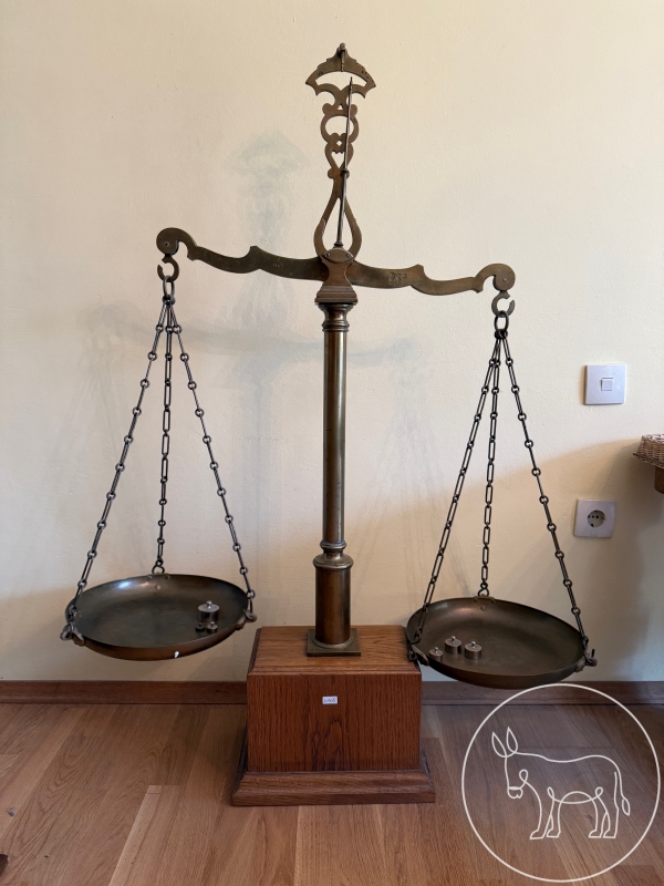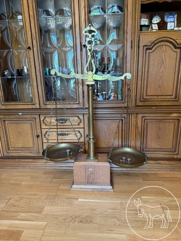 Große Messingwaage auf Holzsockel, Breite 61cm. Höhe 127cm
