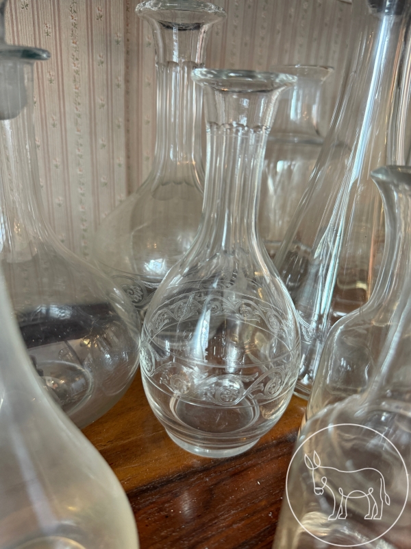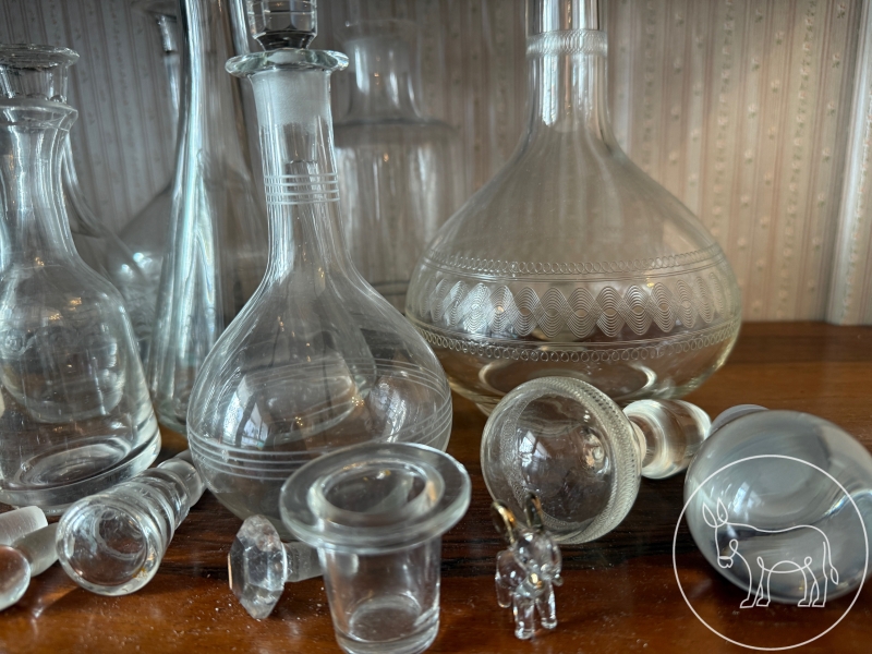 geschliffene und ungeschlieffene Glaskaraffen mit und ohne Stopfen, in unterschiedlichsten Formen und Größen. Zusätzlich eine Sammlung an alten und neuen, geschliffenen und ungeschliffenen Glasstopfen.