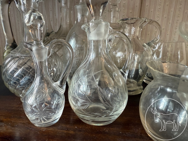 geschliffene und ungeschlieffene Glaskrüge mit und ohne Stopfen, in unterschiedlichsten Formen und Größen.