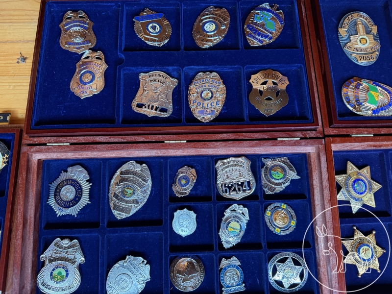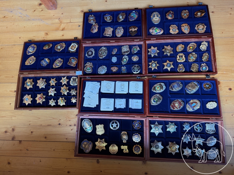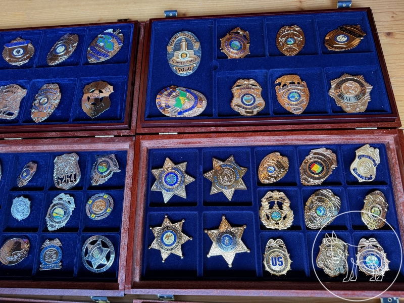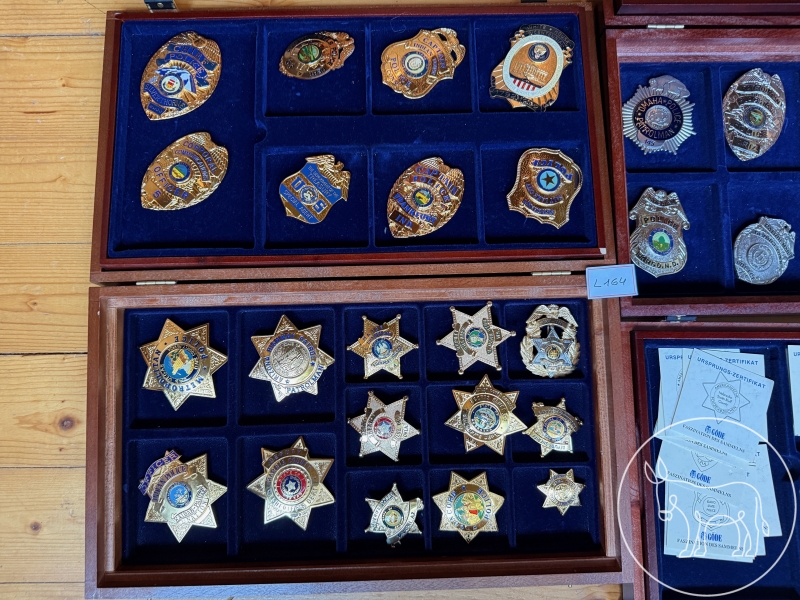 mit Beschreibungen, diverse Polizei-Abzeichen in Holz-Schatullen