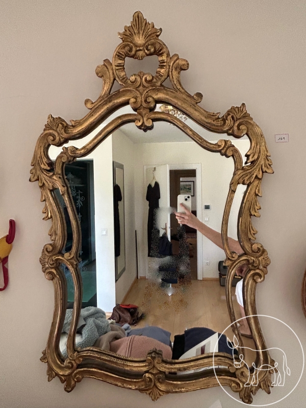 Antiker Spiegel in geschwungenem und verschnörkeltem Goldrahmen. Maß: 68x106cm.