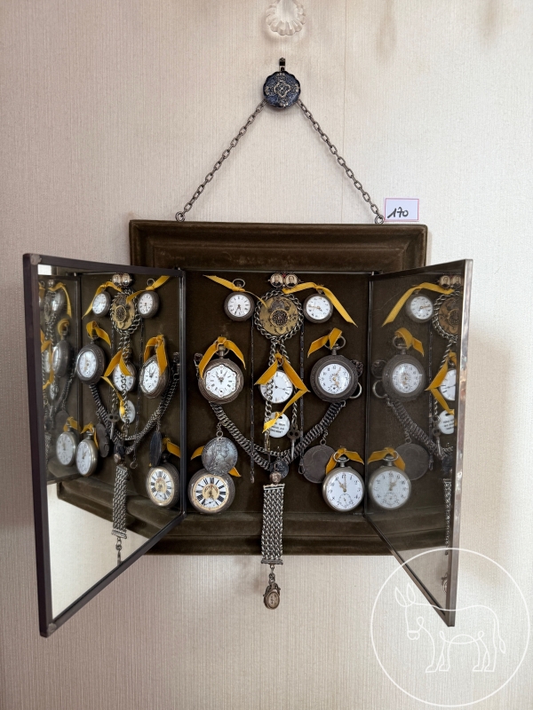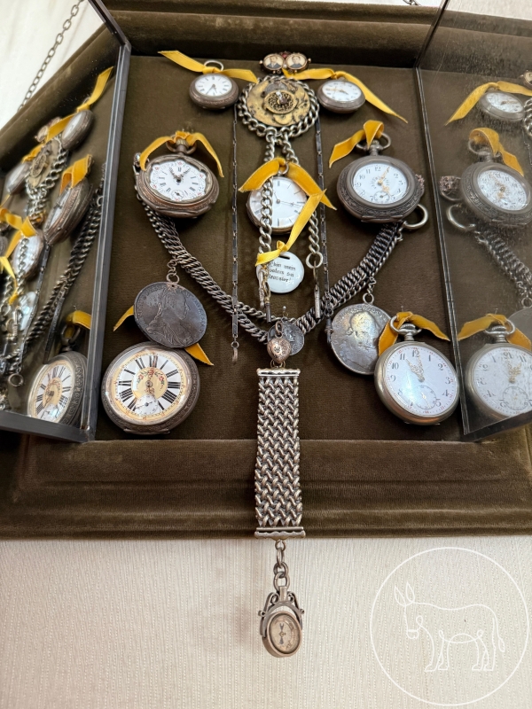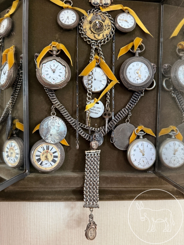 kleines Uhrenmuseum mit vielen Taschenuhren, Uhrenketten und anderen Liebhabereien.