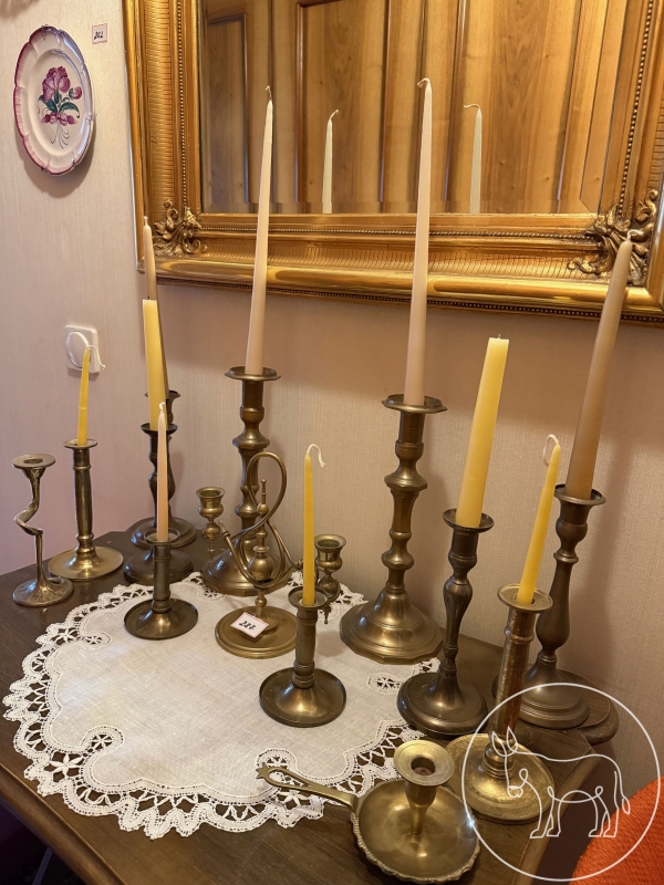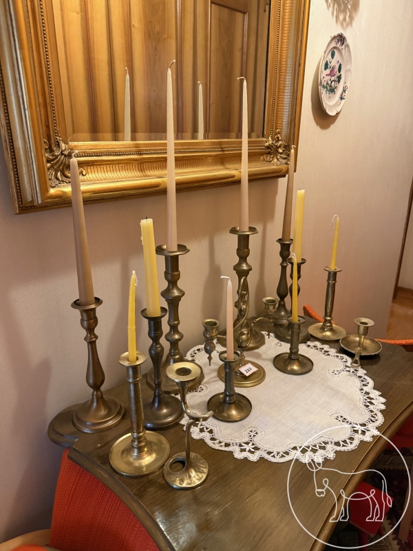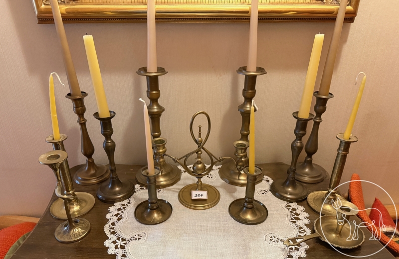 Konvolut aus vielen antiken Messing Kerzenständern, verschiedene Stile (Jugendstil, Biedermeier, etc.). Höhe der beiden höchsten Kerzenständer 30cm. Inklusive Kerzen.