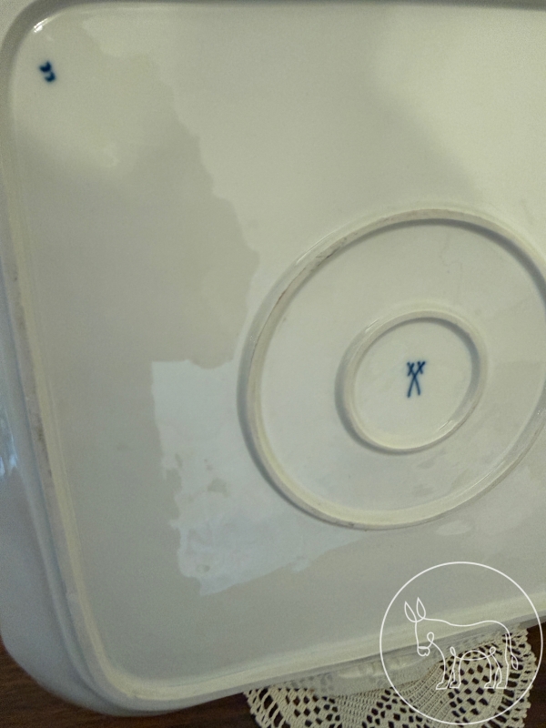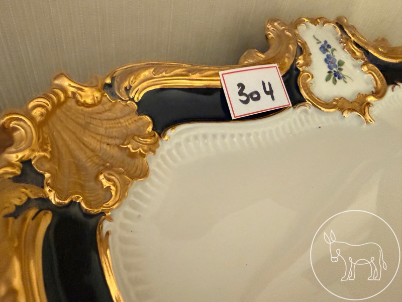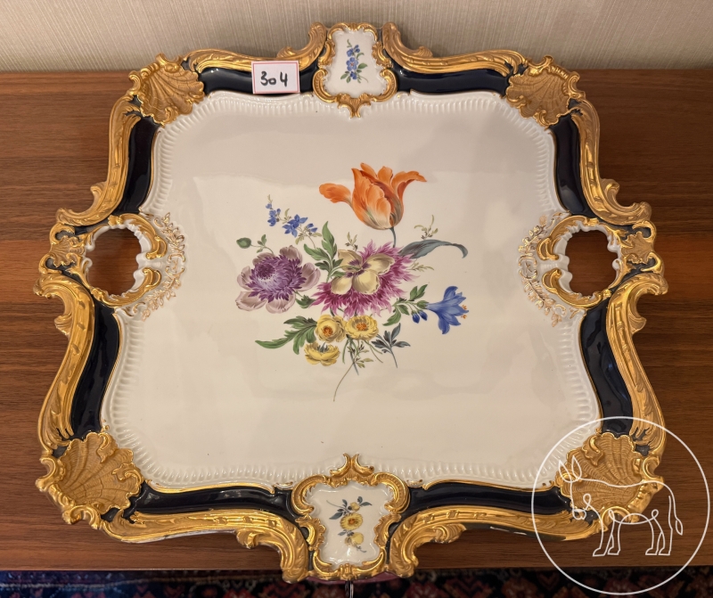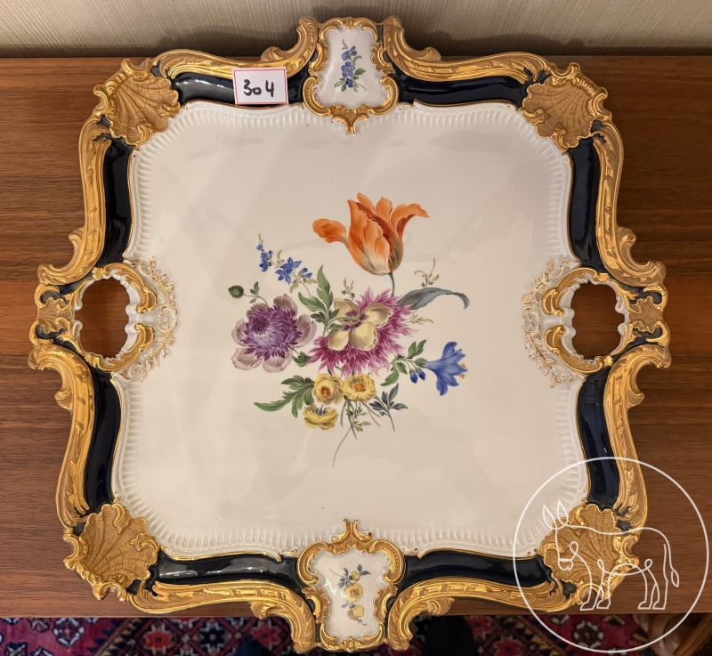 Wunderschöne antike Meissen Porzellan Platte, 1. Qualität, quadratisch geschweifte Wandung mit Rocaillen, Muscheln und integrierten Handhaben, die reich vergoldet und kobaltblau akzentuiert sind. Im Spiegel befindet sich ein fein handgemaltes, großes Blumenbukett auf weißem Grund. Bestens erhalten, Top Zustand. Maß: 41,5x41,5cm