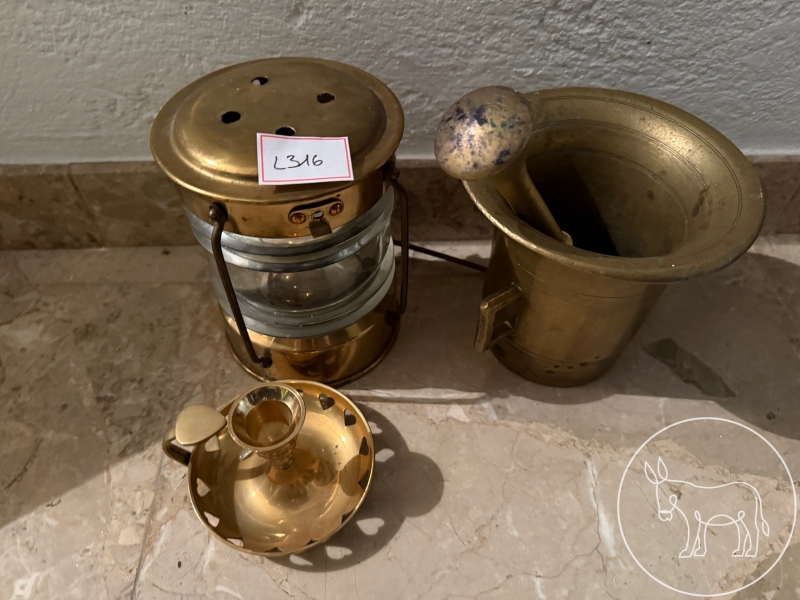 Lampe (Schraube fehlt), Mörser und Kerzenleuchter