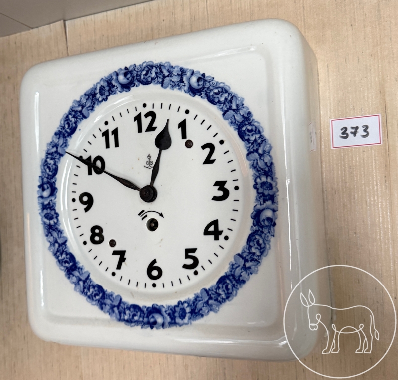 Quadratisches weiß glasiertes Keramikgehäuse mit umlaufenden blauen Blumenmuster. Die Uhr stammt aus der Zeit um 1929/1930 und dem Jugendstil. Maß: 24x24x8cm.