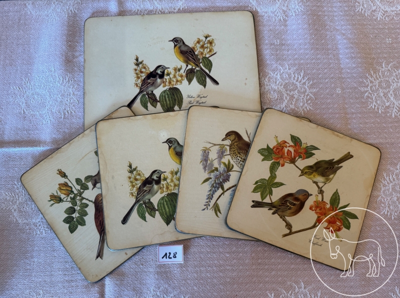 mit Vögeln verzierte Topfuntersetzer. 1x groß (27,5x21,5cm) 4x klein (19,5x19,5cm)