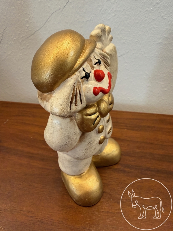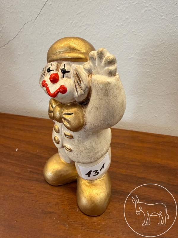 Handgefertigter, handbemalter Clown von Thun aus Bozen. Weiß und vergoldet. B 6cm, H 11cm.