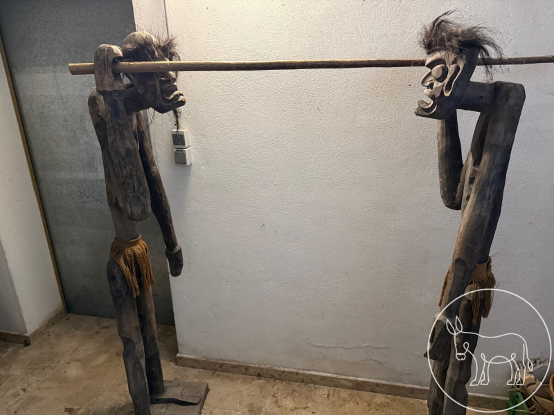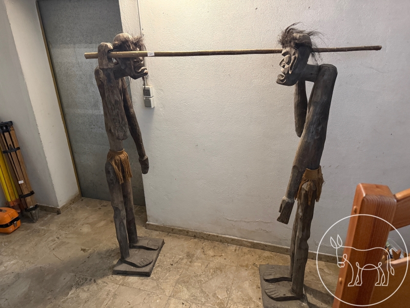2 afrikanische Holzfiguren, die eine Stange halten. Höhe der Figuren 170cm, Breite ca. 38cm. Stange kann individuell lange gewählt werden. Aktuelle Stange ca. 140cm Länge. Es kann aber jede beliebige Stange gehalten werden.