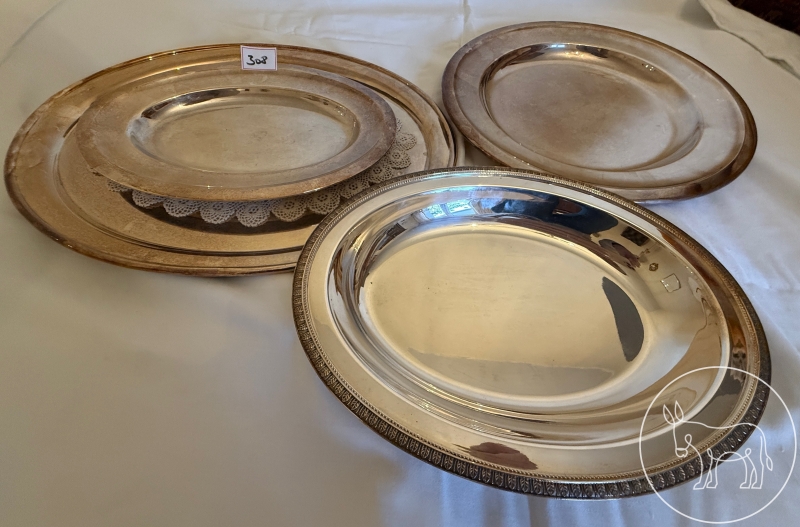 3 aufwändig versilberte Tabletts, 1 Christofl versilberte Schale. 42x33cm, d 42,5, 29,5x21cm, 30,5x23cm