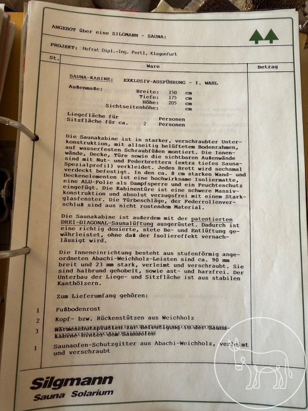 Silgmann Sauna, Außenmaße: Breite 150cm, Tiefe 175cm, Höhe 205cm. Hemlock Tanne: ausgesuchte ast- und Harzarme Qualität. Schriftliche Unterlagen zur Sauna vorhanden.