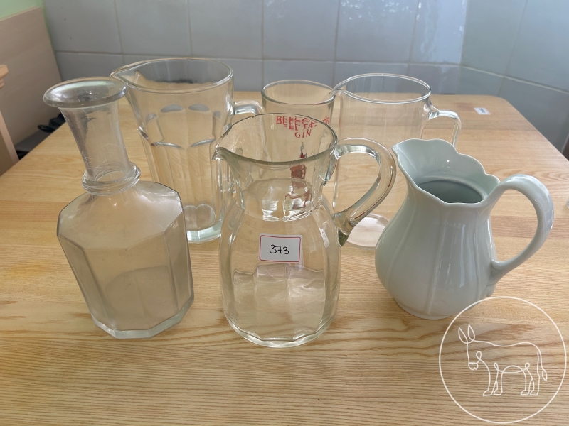 verschiedene Größen, Materialien und Formen. Karaffe mit Hals H25cm, D13cm.