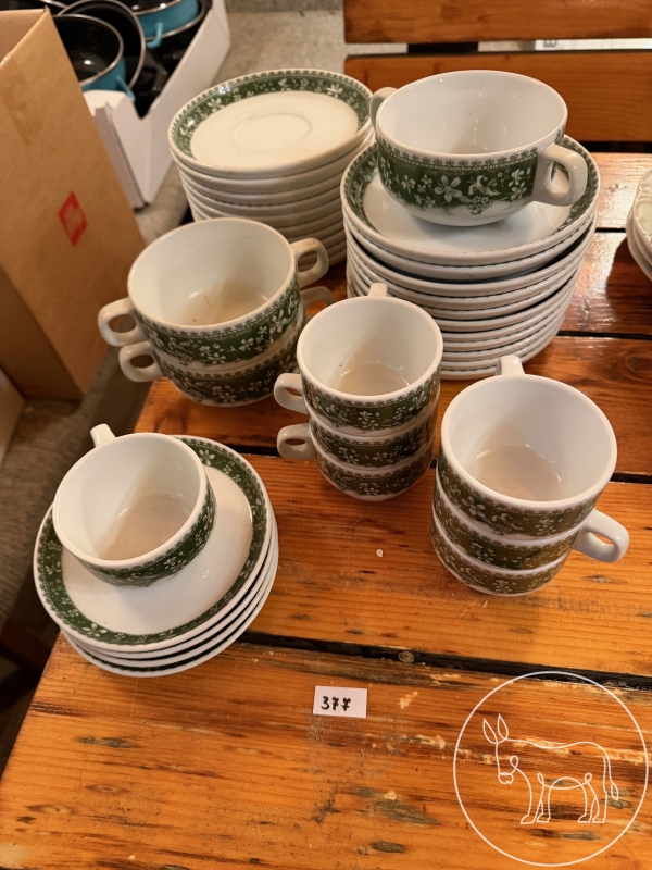 weiß mit grünem Muster, 3 Suppenbehälter, 43 Teller, 4 kleine Teller, 7 Tassen