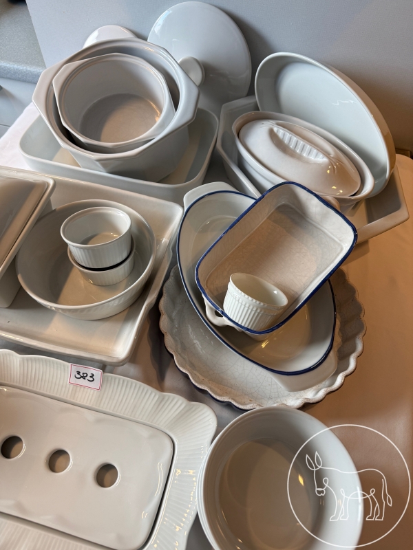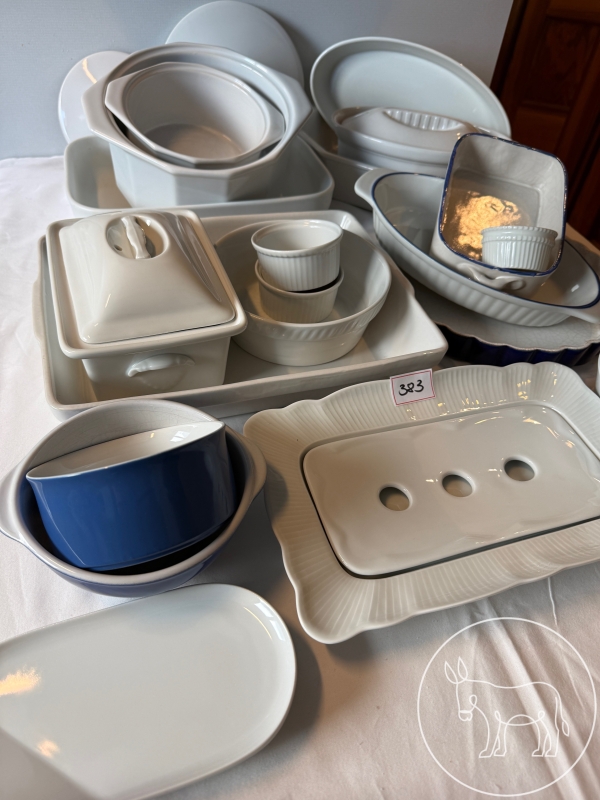 Konvolut aus unterschiedlichsen Auflauf- und Pastetenformen. Ofenfeste Schalen und Schüsseln, teilweise mit Deckel. Spargel- bzw. Gemüse Schale.