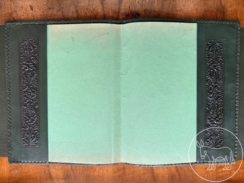 aufwendig gearbeiteter Lederumschlag / -einband. B32cm H40cm. Dunkelgrünes Leder.