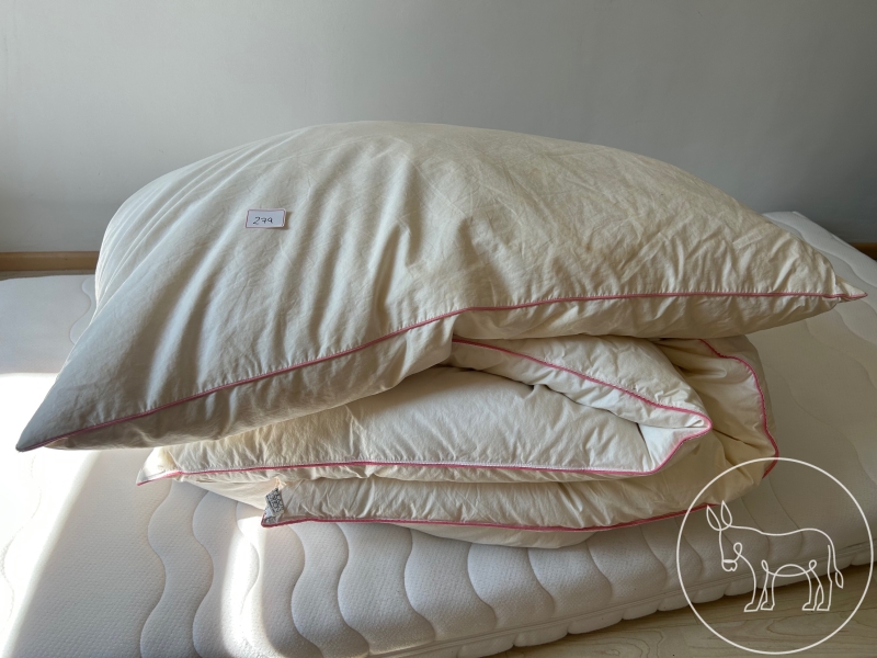 100% Baumwolle mit 100% Daunen/Federn gefüllt. Maß: 140x200 und 70x90cm.