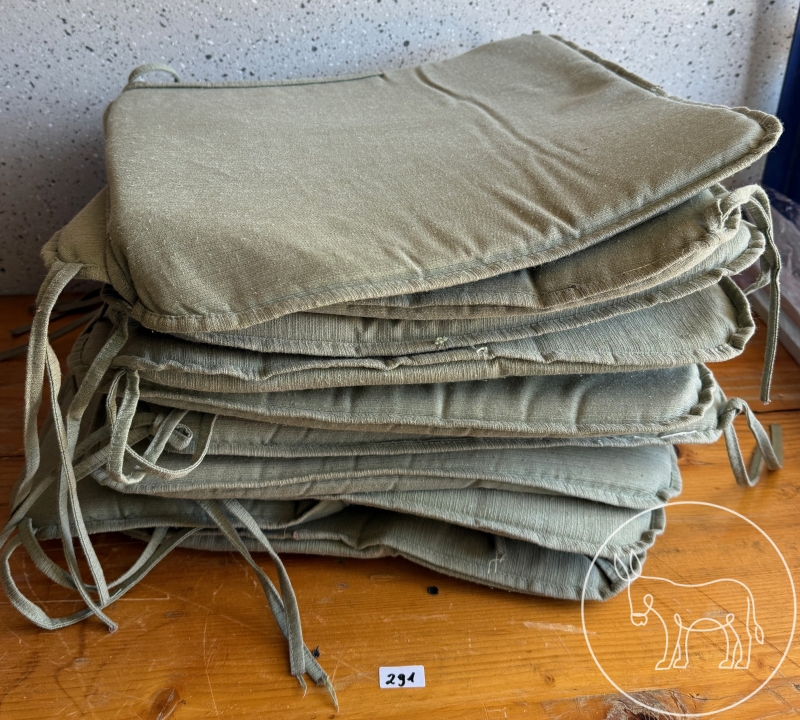 Sitzauflagen gepolsterst mit oliv grünem Bezug und Bändchen, ca. 35x35cm