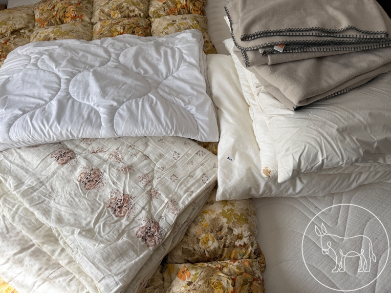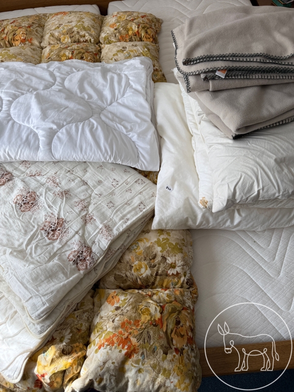 1 gesteppte Daunendecke gemustert, 2 Steppdecken waschbar, 1 Kissen 80x80cm mit Kunstfaserfüllung, 2 Kissen 60x80cm Kunstfaser, 1 Kissen 60x80cm Daune, 2 Fleece Decken.