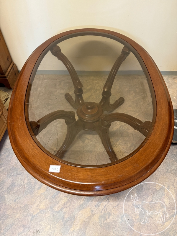 ovaler Couchtisch, mit Rauchglasplatte, geschwungene Beine, Maß: 123x82x52cm.