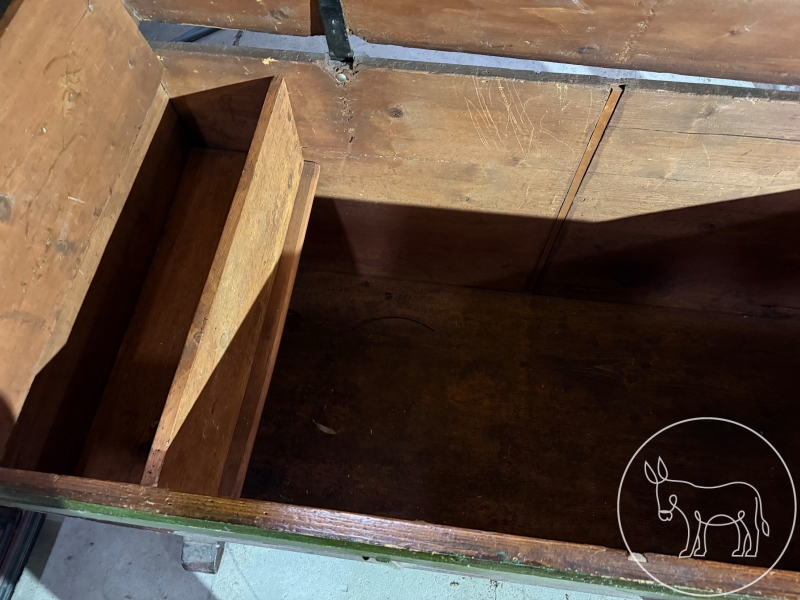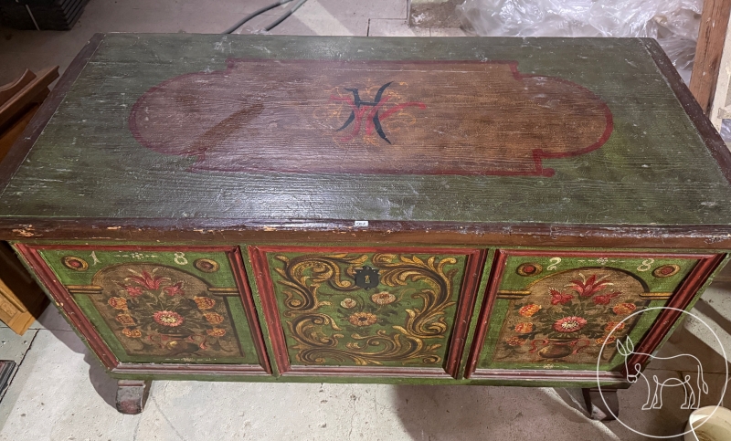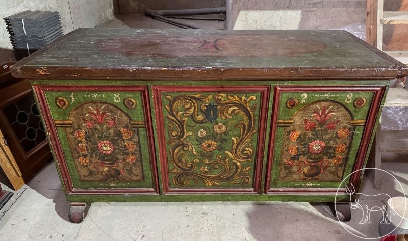 floral bemalte Bauerntruhe. Maß: 156x70x80cm. Mit Griffen.