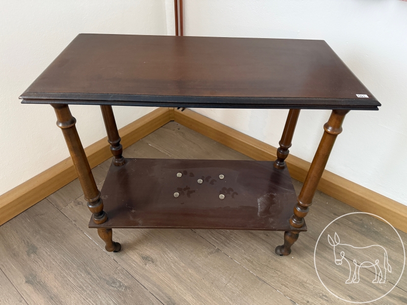 Antiker Fernsehtisch auf Rollen mit gedrechselten Beinen und einer Ablage. Maß: 81x41x76,5cm