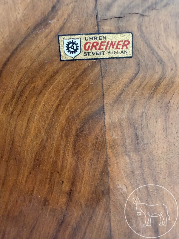 Kaminuhr Holz, Aufkleber von Greiner St. Veit an der Glan auf der Rückseite, Handaufzug. 57x15x22cm