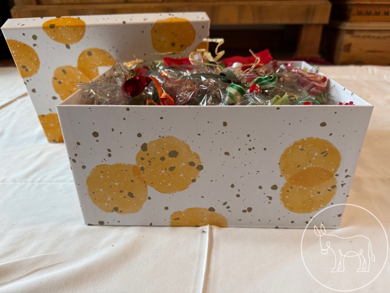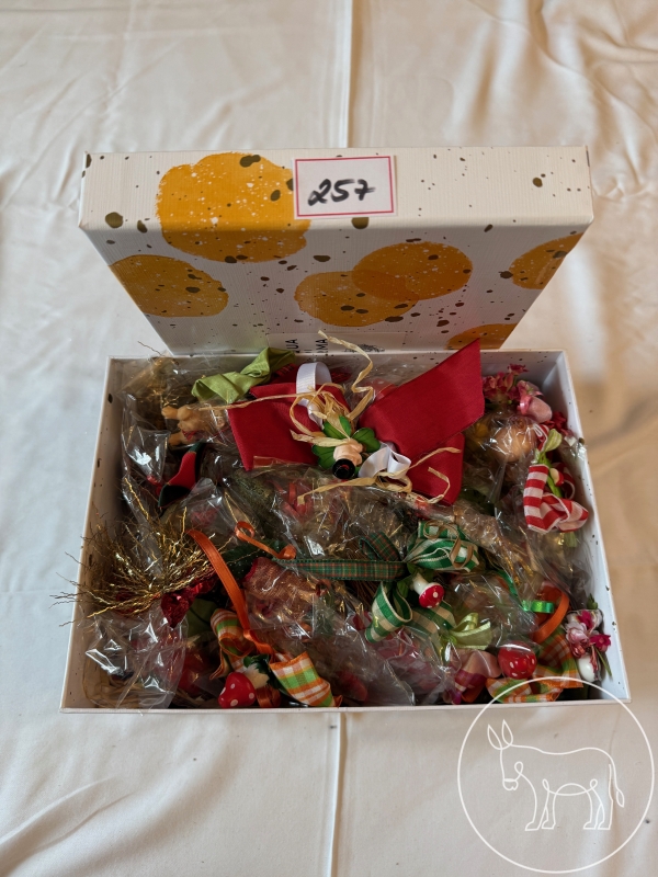 Kiste (Schuhschachtelgröße) voll gestopft mit Glücksbringern