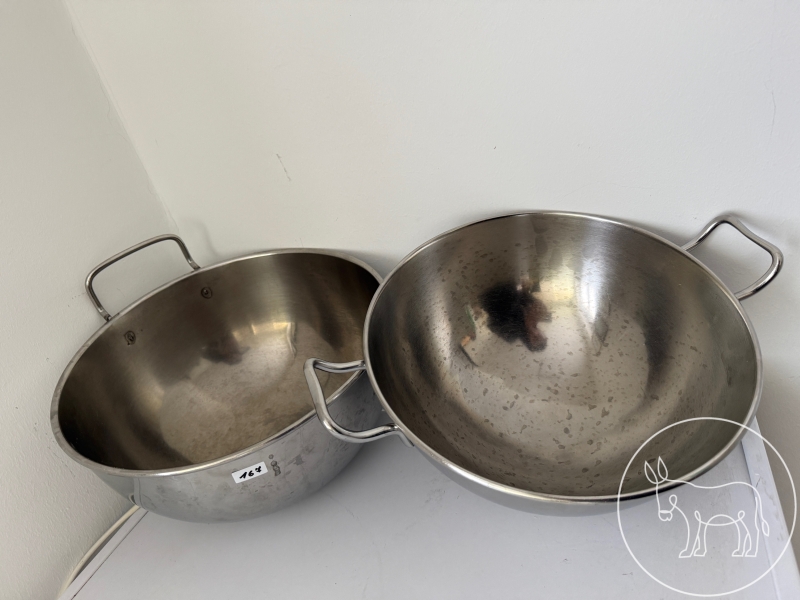 Edelstahl, bei einer fehlt ein Griff, d29,5xh15cm bzw. d32,5xh18cm