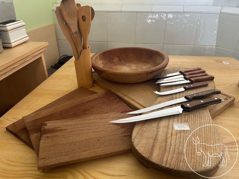 verschiedene Holzbretter in unterschiedlichen Größen, Farbe und Formen, Kochlöffel aus Kolz und Jausen- Käse- und andere Messer
