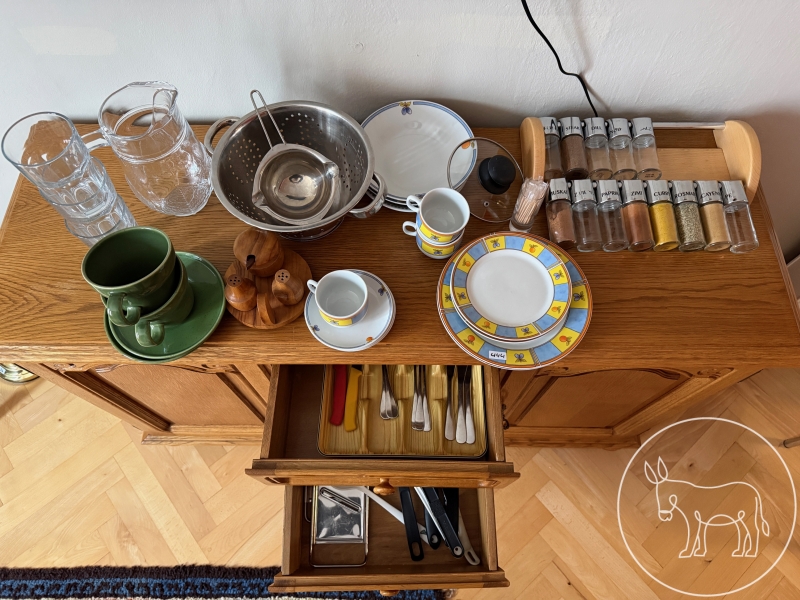 Konvolut an Küchenutensilien und Geschirr für ein Appartement mit 2 Gästen. Küchenhelfer, Gewürzregal, Geschirr, Gläser, etc.
